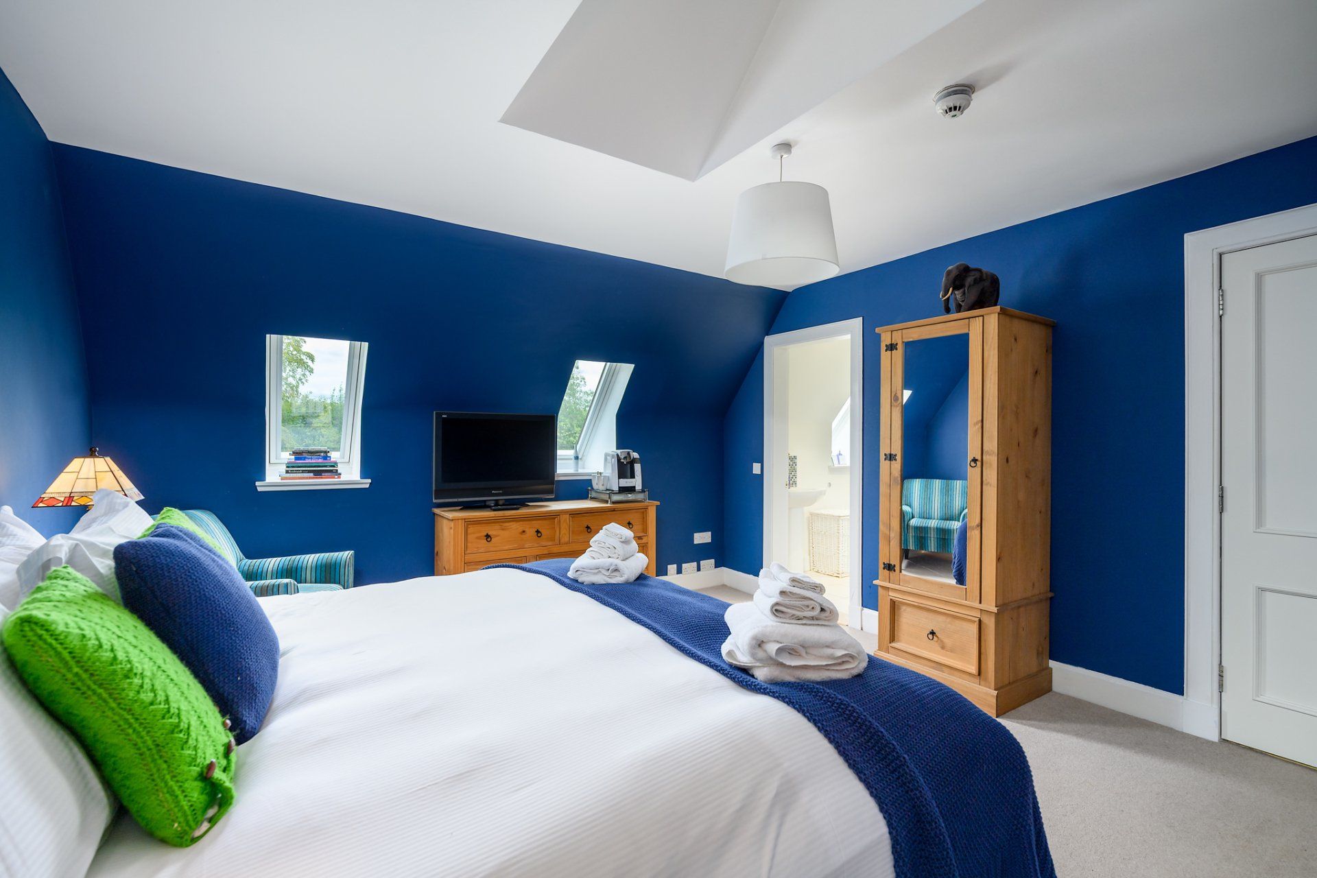 Balmule House offers you a stay in the navy room. This wonderfully cosy room faces north over the front lawn and has the added feature of a skylight. The room benefits from an en suite shower room with a heated towel rail.